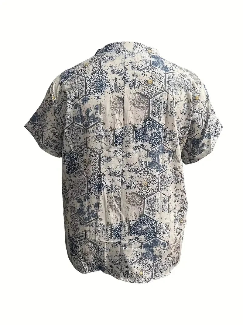 Plus Size Casual Top, Women's Plus Stripe Print Short Sleeve Roll Up Hem Slight Stretch Henley Blouse